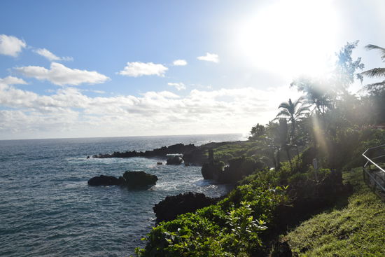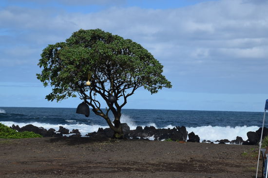 Wir hatten so unsere Probleme mit Maui warm zu werden. Vielleicht lag das auch daran, dass wir hier zum erstenmal Pech hatten und das leider nicht nur einmal. Zunächst freuten wir uns noch, dass wir in nur 40 Min. von Oahu nach Maui fliegen konnten. So einen kurzen Flug hatten wir ja auf der ganzen Reise noch nicht. Doch dann fings an. Wir standen am Gepäckband und unser Gepäck kam einfach nicht. Rahans kam einen Flieger später und meins zwei später. Wäre ja alles nicht so schlimm, wenn wir nicht schon ein Campingpermit hätten. Wir wollten eigentlich im Hellen dort mit unserem Mietwagen ankommen. Ja wir haben uns mal einen Mietwagen gegönnt, um unteranderem die berühmte Road to Hana zu fahren. Diese kurvenreiche Straße führt über 54 kleine Brücken, durch Regenwaldgebiete, an Wasserfällen vorbei nach Hana. Oft ist die Straße nur einspurig und man muss den Gegenverkehr an geeigneten Stellen vorbeilassen. Dank Hawaiin Airlines durften wir die Strecke nun im Dunkeln fahren. Das war mal ein Abenteuer. Zum Glück kamen wir heil am Zeltplatz an und bauten unser Zelt an einer Stelle auf, wo noch nicht so viele Zelte waren. Morgens jedoch fuhr ein Bagger direkt neben unserem Zelt vorbei und parkte dort minutenlang mit laufendem Motor. Das um 7:00 Uhr morgens und nach dieser anstrengenden Fahrt. Wir hatten unser Zelt doch tatsächlich direkt neben einer Baustelle aufgebaut. Toll jetzt wussten wir auch, warum die anderen ihre Zelte weiter weg platziert hatten. Um dem Baustellenlärm zu entkommen, packten wir unsere Strandsachen und legten uns an den schwarzen Sandstrand. Der war wirklich ein Traum, aber leider nur kurz. Es dauerte nicht lange und wir wurden von den Touristenmassen fast überrannt. Der Strand war sehr klein und es kamen einfach viel zu viele Leute. Ich suchte am Campingplatz nach Ruhe. Leider rannten diese Massen, ohne Rücksicht auf die Zeltbewohner, kreuz und quer über den Platz. Ich war total gestresst. Zum Glück verschwanden die Massen abends wieder und die Baustelle hatte übers Wochenende Pause. Tagsüber gingen wir wandern, um den Massen zu entkommen und abends lernten wir viele nette Menschen auf dem Zeltplatz kennen. So konnte ich mich mit diesem Ort doch noch anfreunden. Die Natur ist nämlich wirklich einmalig. Riesige Wellen klatschen auf die schwarzen Klippen aus Vulkangestein. Auf den Klippen wachsen Palmen und knallgrüne Pflanzen. Man sieht Blowholes. Das sind Löcher, die ab und zu mit Meerwasser geflutet werden und dann wie Geysire Wasser speien. Wirklich beeindruckend.