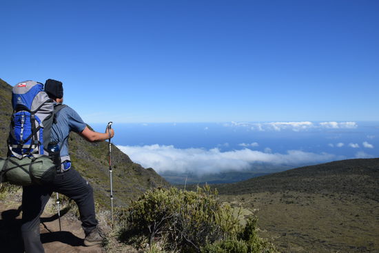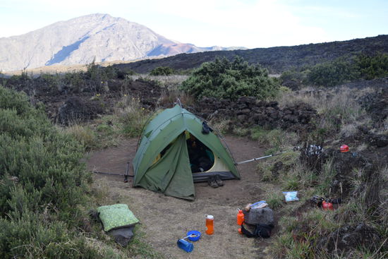 Neben dem Schnorcheln hat uns die Wanderrung in den Haleakala Krater am meisten beeindruckt. Zunächst fährt man mit dem Auto eine kurvenreiche Straße den Krater hoch und der ist wirklich mal hoch. So um die 3000 m. Dort haben wir in der Nähe des Gipfels gezeltet, um den spektakulären Sonnenaufgang zu beobachten. Um halb fünf klingelte der Wecker. Ach übrigens konnten wir auch diese Nacht kaum schlafen, weil ein paar durchgeknallte Hippis neben unserem Zelt total abgegangen sind. Ok, aber zurück zum Krater. Wir fuhren im Dunkeln zum Gipfel. Dort sah ich zum ersten Mal die Sonne über den Wolken aufgehen. Es war wirklich ein krasser Anblick. Man kam sich vor, wie auf einer Insel zwischen den Wolken. Hier oben war es auch arschkalt. Im und auf dem Krater kann es tags bis zu 27 C° und nachts 0 C° werden. Diese Temperaturunterschiede spürten wir auch bei unserer Wanderung. Ich habe mich so gefreut. Wir trugen alles für eine dreitägige Tour mit uns. Vom Gipfel aus folgten wir einem Pfad dem Kraterrand hinunter. Zunächst kam man sich vor, wie auf einem anderen Planeten. Alles war karg und staubig. Bald ließen wir die Touristenmassen hinter uns und waren tatsächlich allein. Es war so ruhig hier im Krater. So eine Ruhe habe ich bisher nur in Grönland erlebt. Man hört einfach mal gar nix, außer dem eigenen Puls im Ohr. Das ist wirklich eine krasse Erfahrung. Die Landschaft im Krater blieb aber keines Falls langweilig. Wir zelteten in grünen Oasen mit den lustigsten Vögeln. Nachts war der Himmel so klar, dass man einen wirklich unglaublichen Sternenhimmel sah. Wir lagen auf unseren Isomatten und versuchten die Sternenbilder zu deuten. Auf den beiden Zeltplätzen trafen wir immer dieselben netten Leute. Insgesamt gabs aber nur 4 Zelte und eine Gruppe die in Hütten schlief. Ich war wieder total im Wandermodus und war wirklich traurig nur drei Tage zu wandern, aber für den Krater kriegt man höchstens ein dreitägiges Permit. Das einzige, was uns auf dieser Tour echt zu schaffen machte, war die Hitze und die Höhensonne, aber abends wurde es zum Glück schnell kühl. Sehr schön war noch die letzte Etappe. Wie schon auf Grönland, ließen Rahan und ich uns viel Zeit und starteten sehr spät. Alle anderen waren längst weg. Wir quälten uns in der Mittagshitze den Kraterrand hinauf. Am Parkplatz angekommen jubelten uns unsere Wanderfreunde aus dem Krater zu und drückten uns zwei eiskalte Bier in die Hand. Das war so lieb und tat so gut.