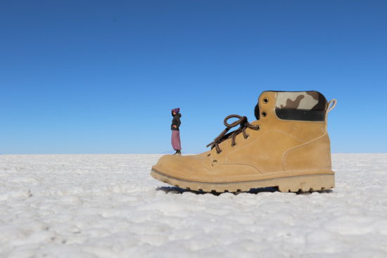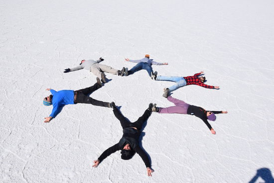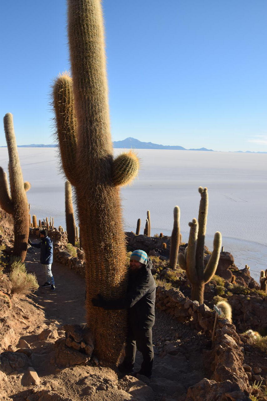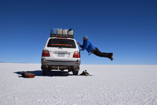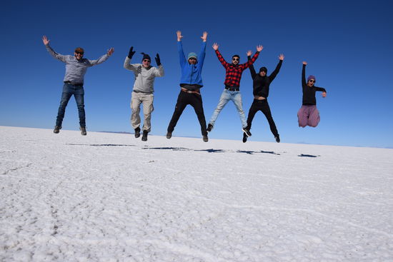 Am naechsten Morgen gings sehr frueh los, da wir den Sonnenaufgang in der Salzwueste sehen wollten. Diese Wueste war wirklich der Hoehepunkt der Tour. Man konnte so weit schauen und wenn man lief, knirschte das Salz unter den Schuhen. Wir fruehstueckten neben einer kleinen Kaktusinsel mitten in der Salzwueste. Ich staunte, dass bei diesen eisigen Temperaturen ueberhaupt Kakteen wachsen koennen. Nach dem Fruehstueck kam das Fotoshooting. In dieser unwirklichen Landschaft kann man naemlich die witzigsten Fotos schiessen. Man kann Gegenstaende kleiner oder groesser wirken lassen. Wir hatten so einen Spass und wurden immer kreativer. Ich konnte gar nicht genug davon bekommen, aber irgendwann mussten wir ja weiter. Elias setzte uns in der Stadt Uyuni ab. Diese Stadt war so haesslich und ich hoffte nur, dass der Rest von Bolivien nicht auch so aussah. Alles wirkte so aermlich und der Muell stapelte sich in der Mitte der Strasse. Schweren Herzens mussten wir uns von dieser tollen Truppe verabschieden, da nun alle wieder getrennte Wege gingen. Nur unser treuer Freund Diego reiste natuerlich wieder mit uns mit. Wir beschlossen mit dem Nachtbus weiter nach Sucre zu reisen, da es uns hier ueberhaupt nicht gefiel. Nun hiess es Zeit totschlagen, da es erst nachmittags war. Zum Glueck fand gerade so eine Art Jahrmarkt statt und das war so spannend. Es gab jede Menge Gluecksspiel und klappriger Fahrgeschaefte. Ausserdem konnte man direkt auf dem Jahrmarkt heiraten. Echt nicht zu glauben. Es war so eine Partystimmung mit Technomusik und dabei sollte man heiraten. So lustig. Zum Glueck war es bald soweit und wir konnten in den Nachtbus. Dieser hatte doch tatsaechlich keine Heizung und Toilette. Ich bibberte die ganze Nacht und konnte mal wieder nicht schlafen. Mitten in der Nacht wurden wir zum Pinkeln rausgelassen. Die bolivianischen Frauen kennen keine Scham und pinkelten direkt vor den Bus. Ich suchte mit Rahan eine geschuetztere Stelle hinter einem Haus. Rahan verhedderte sich in einem Stacheldraht, aber verletzte sich zum Glueck nicht. Eine wuetende Einheimische kam aus dem Haus und vertrieb uns alle. Ist ja auch verstaendlich. Zum Glueck kam sie erst nachdem wir unser Geschaeft verrichtet hatten.