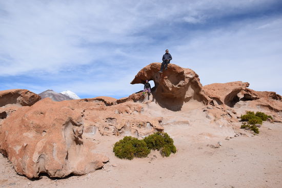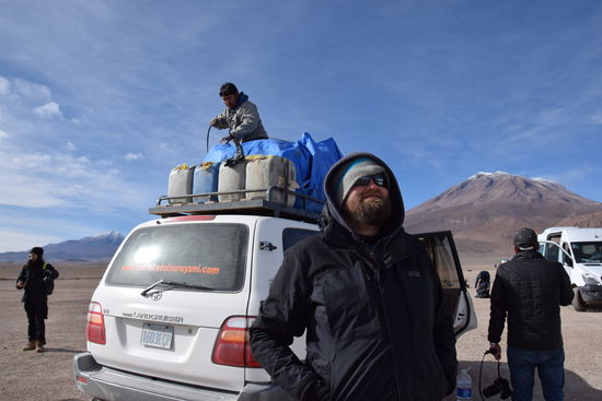 Schon um vier Uhr morgens wurden wir mit dem Minibus vom Hostel abgeholt. Was fuer eine unmenschliche Uhrzeit. Aber was sollten wir machen? Der naechste Grenzuebergang nach Bolivien war leider aufgrund von starkem Schneefall gesperrt und so mussten wir einen grossen Umweg fahren. Leider war auch ein grosser Teil eines Nationalparks im Sueden von Bolivien gesperrt und so wurde unsere Strecke geaendert. Das war aber ueberhaupt nicht schlimm und mir kam es auch gar nicht so vor, als ob wir etwas verpasst haetten. Die Tour war einfach der Hammer. Der Minibus fuhr uns an die bolivische Grenze und dort gings mit dem Jeep weiter. Vorher bereitete unser Tourguide aber ein koestliches Fruehstueck vor. Endlich mal nix Suesses. Es gab Avocado, Kaese und Baguette. Unsere Reisegruppe war auch super. Wir reisten mit Paulo und Pinga aus Brasilien und Siegfried aus Oesterreich. Wir verstanden uns alle prima. Besonders lustig war Pinga. Er traellerte uebrall Metalsongs, da er naemlich in seiner Freizeit in einer Heavy Metal Band spielte. Das war so witzig. Nur an einer Flamingolagune waren alle ein bisschen sauer, weil er so laut sang, das alle Flamingos vor schreck wegflogen. Flamingos waren ein Highlight dieser Tour. Wir konnten sie in unzaehligen Lagunen bestaunen. Irgendwie kamen einen diese Tiere hier so fehl am Platz vor. Die Landschaft ist hier so karg und es ist so kalt. Man wundert sich echt, dass sich diese pinken Kerle nicht die Fuesse abfrieren. Neben den Flamingos, gab es auch ueberall Lamas zu bestaunen. Unser Tourguide war Bolivianer und hiess Elias. Er war auch super nett. Sein Essen schmeckte klasse und er konnte uns viel ueber die Landschaft erzaehlen. Er machte auch lange Stopps, damit wir alles in Ruhe erkunden und Fotos machen konnten. Waehrend dieser drei Tagestour fuhren wir auch wieder ueber 4000 Hoehenmeter rauf. Zum Glueck ass ich vorher ordentlich und mir gings gut. Rahan vertrug die Hoehe nicht ganz so gut und schlief vor Erschoepfung oft ein. Neben den Lagunen besuchten wir auch Felsformationen, die in diesem besonderem Licht so klasse aussahen. Wir machten so viele Fotos. Es machte auch tierisch Spass die Felsen hochzuklettern, doch als ich runter kam war ich fix und fertig. Da merkte ich doch, dass die Luft hier sehr duenn war. 2 Naechte ubernachteten wir in einem Hostel und in einem Hotel. Das Hostel war ein richtiger Kulturschock. Es wurde von bolivianischen Frauen betrieben, die alle sehr traditionell gekleidet waren. Leider waren sie nicht die Freundlichsten oder zumindestens wirkte es so. Zunaechst hatten wir keinen Strom und fragten nach einer Kerze. Sobald der Strom ging, wurde sie uns ohne wenn und aber wieder weggenommen. Das Beste war aber die Dusche. Wir sollten extra bezahlen. Es war so schweinekalt, so um die Null Grad. Rahan bezahlte und bekam eine lauwarme Dusche. Ich habe Rahan noch nie so frieren gesehen. Er schrie nur noch vor Kaelte und die gesamte Reisegruppe lachte. Ich ging neben der Dusche aufs Klo und sofort kam eine der freundlichen Damen um die Ecke. Ich sollte bezahlen, da sie mich mit Rahan in der Dusche vermuteten. Rahan stand splitternackt vor der Dusche und regte sich auf. Der Dame war das egal und sie verschwand erst, als sie verstand, dass ich nur auf dem Klo war. Diego und ich konnten nicht mehr vor lachen. Ich hatte solche Bauchschmerzen vor lachen und der arme Rahan bibberte nur noch. Ich verzichtete nach dieser Aktion auf die Dusche.