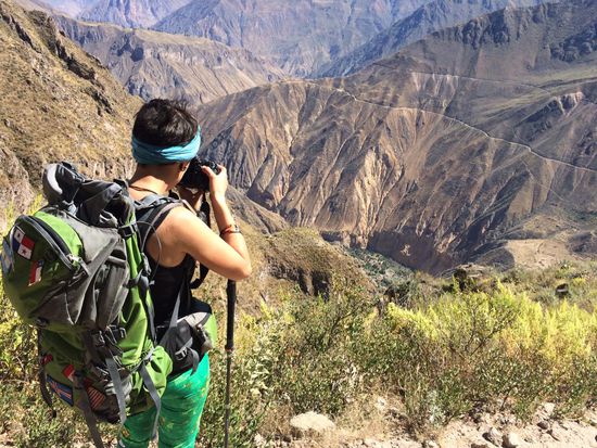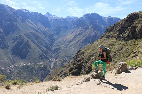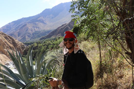 Doch plötzlich lösten sich alle Sorgen in Luft auf. Rahan gings am nächsten Morgen besser, aber fit war er noch nicht. Ich kam auf die Lösung, mit dem Zug einen Tagestrip zum Machu Picchu zu machen und Diego fragte, ob wir nicht einfach ne dreitägige Wandertour in der Nähe machen wollten. Super Idee! So konnte Rahan sich erholen und ich kam trotzdem zum Wandern. Zum Glück war Daniela mit ner Freundin unterwegs und konnte mit ihr wandern. So reiste ich abends mit Diego in Richtung Colca Canyon. Rahan begleitete uns zum Busbahnhof und er wurde immer fitter. Es war echt ein bisschen komisch, nach so langer Zeit mal ein paar Tage ohne Rahan zu sein. Auf der anderen Seite war es echt super, dass Diego auch so gern wandern geht. Die letzten Touren hatte Rahan nämlich verflucht. So konnte jeder das machen, was er gern macht. An unserem ersten Tag fuhren wir morgens mit dem Bus zum Condoraussichtspunkt. Da war vielleicht ein Andrang. Jedes Mal, wenn ein Condor angeflogen kam, jubelten alle. Ein bisschen so als ob ein Popstar um die Ecke kommt. Aber man muss auch sagen, dass diese riesen Vögel innerhalb dieses Canyons sehr beeindruckend aussahen. Weiter gings wieder mit dem Bus und am Start unseres Treks, waren gar keine Leute zu sehen. Ich war so froh, dass wir keine Tour gebucht hatten. Diego wollte am Anfang eine buchen, da man sich um nichts kümmern braucht. Aber alle Touren starten fast zur gleichen Zeit und dann laufen die Menschenmassen den Canyon hinunter. Echt nix für mich. Da wir mit dem Dreiradtaxi und öffentlichen Bussen unterwegs waren, waren wir langsamer als die Touren. Wir hatten eine krasse Aussicht über den Canyon und erkannten die kleinen Orte, die wir in unserer Tour passieren würden. Es ging nur bergab und die Sonne brannte. Es war so heiß. Zum Glück gab Diego mir sein Cap und er zog sich lustige Tücher über dem Kopf. Ihm machte die Hitze nicht so zu schaffen, aber ist ja auch kein Wunder. Er ist halt in Kolumbien aufgewachsen. Trotzdem erreichten wir den Fluss viel schneller als gedacht. Wir überquerten den Fluss und auf der anderen Seite des Canyons wurde es richtig grün. Zwischen Feigenbäumen und Kakteen gings weiter. Diego machte den Vorschlag zwei Tagesetappen in einer zu laufen und morgen den ganzen Tag in der Oase zu relaxen. Klar wir waren so schnell, warum nicht? Am frühen abend kamen wir in der sogenannten Oase an. Es gab Palmen, Orchideen und Pools. Es war das Paradies nach dieser Hitze. Zur Abkühlung sprangen wir erstmal in den Pool und tranken kaltes Bier. Kann es was besseres geben? Tja Rahan könnte da sein. Es würde ihm hier prima gefallen, aber er war einfach noch nicht fit genug. Zum Glück kühlte ich jetzt endlich ab und mein Kopf nahm wieder eine normle Gesichtsfarbe an. Diego wollte mir nicht glauben, dass ich keinen Sonnenbrand hatte. In unserer Unterkunft waren erstaunlicherweise gar nicht so viele Gäste. Nach dem Abendessen schliefen wir, nach diesem anstrengenden Tag, ziemlich schnell ein. Nachts vermutete ich jedoch Nagetierbefall und hatte Angst um meinen Käse. Ich weckte Diego und der meinte, dass das sicherlich nur Babypapageien seien. Naja jemand der aus Kolumbien kommt, wird sich wohl mit Papageien auskennen. Im Endeffekt war es ein kaputter Wasserschlauch. Ich musste so lachen.