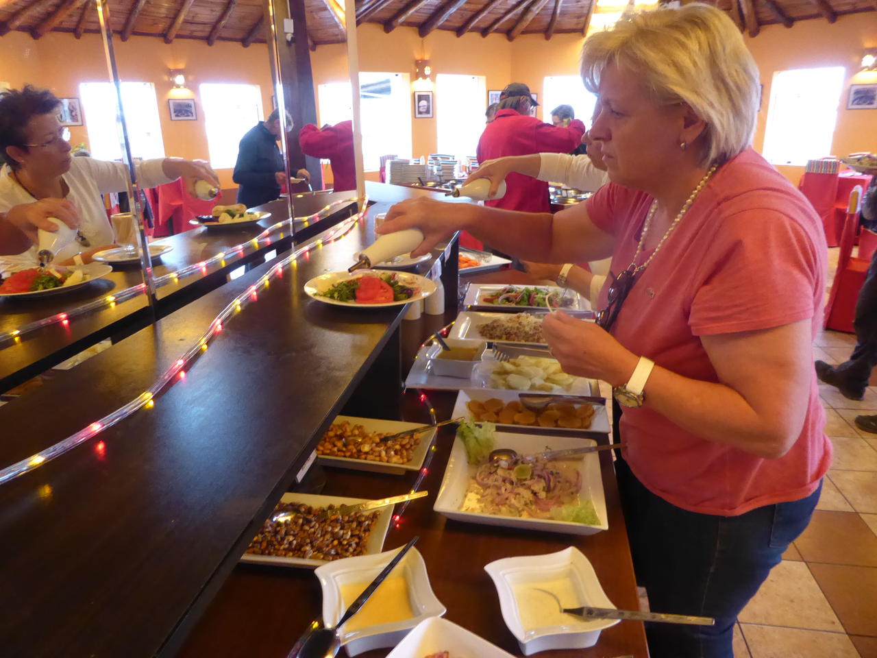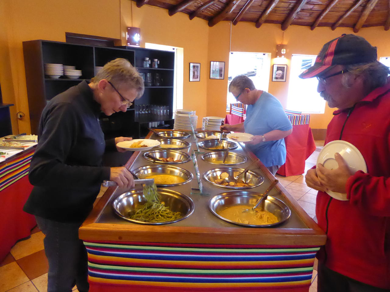 Es ist inzwischen Mittag geworden. Zeit für Mittagessen. Wir sind ungefähr auf der halben Strecke zwischen Cusco und dem Titicacasee und weil auf dieser Tagesstrecke viele Touristenbusse verkehren, gibt es hier in der Gegend ein paar Restaurants, die für diese Kundschaft Mittagsbuffet anbieten.