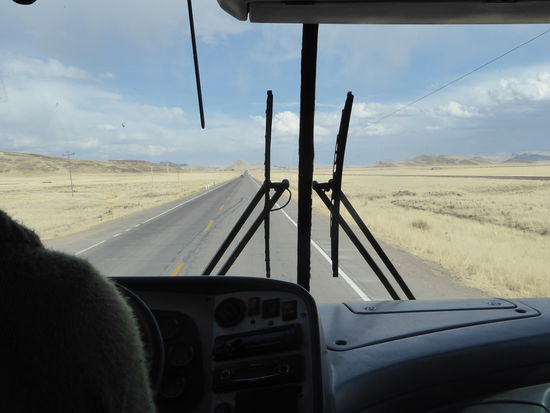 Wir fahren weiter, die Strasse zieht sich jetzt schnurgerade durch das Hochland, das Altiplano. Links und rechts der Strasse wachsen nur noch dürre Grasbüschel. Doch immer noch leben Menschen hier, weiden ihre Tiere. Alpakas, Lamas und Schafe. Ton in Ton fügen sich die Tiere und Häuser in die Farben der Landschaft ein. Eine Welt in Ocker, gelb und braun. Eine wunderbare Welt der Farben. Fotografieren fällt fast weg, weil die Fensterscheiben spiegeln und die Scheiben ausserdem leicht verdunkelt sind. Also füllen wir unseren eigenen Speicher mit den eindrücklichen Bildern.