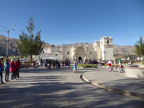 In Yanque halten wir an. Hier tanzen jeden Morgen die Kinder auf dem Platz vor der Kirche um den Brunnen. Aus einem Lautsprecher erklingt Musik. Die Kinder tanzen einen alten Tanz der Geschlechter. Die Buben sind als Mädchen verkleidet, damit man sie nicht erkennt. Sie tragen alle die typische Tracht des Colca-Tales mit der feinen Stickerei und den weissen Hüten.