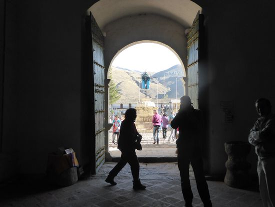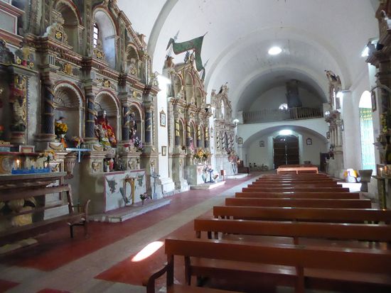 Die Kirche ist ganz eigenartig angelegt. Vom Hauptplatz betritt man sie durch die Seitentüre. Der Hauptaltar ist mit viel Silber verziert, aber es wurde schon viel davon gestohlen. Auch in jüngster Zeit.
