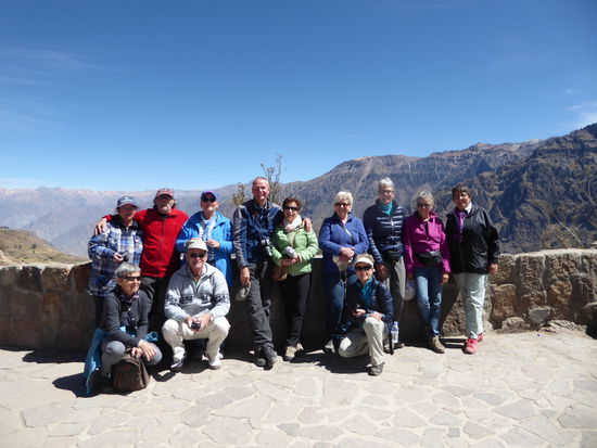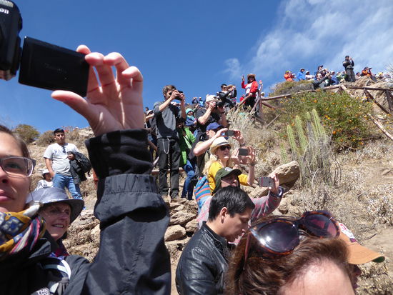 Bereits haben sich gegen 200 - 300 Leute eingefunden. Mit gezückten Kameras stehen sie an den Abschrankungen, erkunden das Tal unter ihnen. 1000 Meter tief soll es hier sein und den Fluss unten kann man nicht mehr erkennen, denn das Tal ist jetzt sehr schmal. Irgendwo unter uns haben die Condore ihre Horte in der unzugänglichen Felswand.