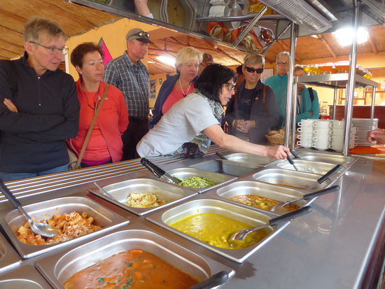 Wir fahren zurück nach Chivay. Dort hat Paulina in einem Touristenrestaurant einen Tisch für uns reserviert. Es gibt ein reichhaltiges Buffet, so dass sich jeder sein Menu selber zusammen stellen kann. Auch Alpacafleisch und Quinoa-Risotto fehlen nicht. Es gibt Suppe, Salat und verschiedene Fleischgerichte mit Beilagen. Und auch für eine Dessertauswahl ist gesorgt.