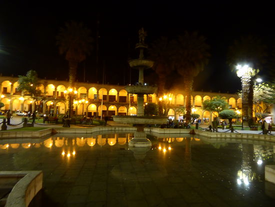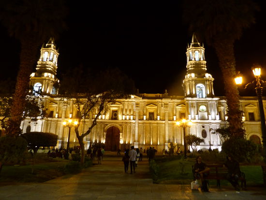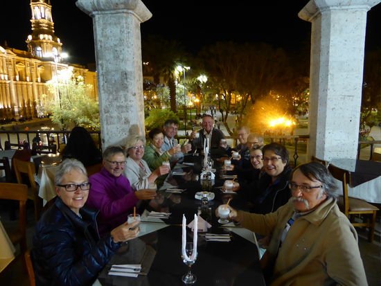 Später treffen wir uns zum Nachtessen, bummeln gemeinsam zum Hauptplatz wo wir die beleuchtete Kathedrale und die Doppelarkaden rundum bewundern. Und dann kehren wir auf einer Terrasse ein. Der junge Kellner freut sich über die Gruppe und offeriert uns allen einen Begrüssungs-PiscoSour. Dadurch hat er unsere Sympathie gewonnen und auch die beiden Musikanten bereichern die Stimmung mit ihrer Andenmusik.