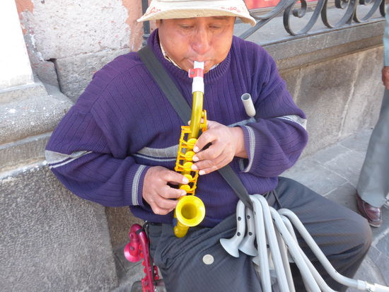 Später warte ich beim Hotel gegenüber dem Kloster auf die Gruppe. Ich rede ein wenig mit Miguel, der leere Flaschen auf ein Fahrrad mit Ladefläche stapelt. Er kauft sie in den Restaurants und verkauft sie für ein paar Soles weiter. Und mit dem Verkäufer, der am Boden sitzt und in ein selbstgebasteltes Saxophon bläst. Aus Rohrabfällen hat er es gemacht und versucht jetzt ein paar davon zu verkaufen. Und die junge Frau daneben verkauft Hüte, einen ganzen Stapel davon hat sie sich auf den Kopf getürmt. Einer verkauft Batterien. Ganz einfache Batterien, wie man sie für Taschenlampen braucht.