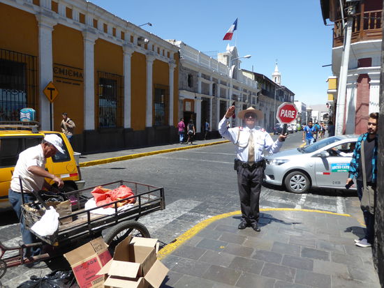 Bei der Kreuzung vor dem Catalinenkloster steht ein Polizist mit einer schmucken weissen Uniform. Meistens bleibt er zwar im Schatten der nahen Alpaka-Boutique oder im schattigen Eingang des Klosters. Dann und wann schiesst er hinaus, hält mit seiner roten Kelle den gesamten Verkehr auf und hilft damit einer Dame, zum Beispiel mir, über die Strasse. Ja, das sei seine Aufgabe, erklärt er. Für Ordnung auf der Strasse sorgen. Und dann will er wissen, woher ich komme. "Viva Suiza", salutiert er. Ich salutiere zurück: "Viva Peru".