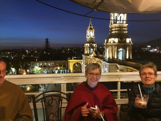 Nach fünf Uhr treffen wir uns beim Hotel und spazieren gemütlich zur Kathedrale. Da in den Lauben gibt es ganz oben eine Terrasse. Mit fantastischem Blick auf den Sonnenuntergang. Hier habe ich einen Tisch reserviert und bei einem feinen Maracuja Sour, eingemummelt in warme Ponchos geniessen wir das Schauspiel.