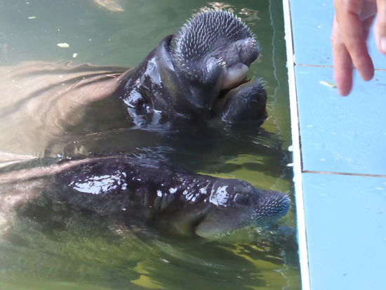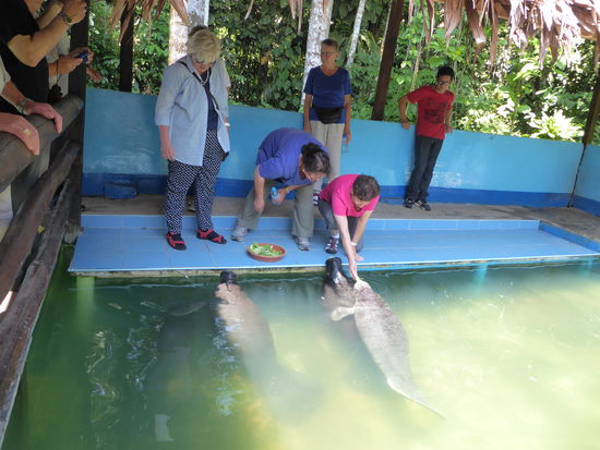 Das wichtigste Tier ist aber das Manati, die Seekuh. Seekühe werden von den Leuten gejagt und gegessen und oft bleibt dann ein Junges zurück, das ohne Mutter keine Überlebenschance hat. Wenn es Glück hat, wird es ins Rescue-Center gebracht und hier aufgezogen. Zwei Jahre lang werden sie mit einer reichhaltigen Milch gefüttert und dann noch eine Zeitlang mit Wasserpflanzen. Wir dürfen Sie füttern und lernen viel über diese eigentümlichen Tiere.