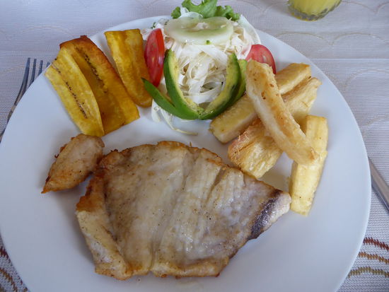 Mittagessen ist jetzt angesagt. In einem Restaurant gibt es ein typisches Gericht: gebratene Bananen, Palmherzensalat mit Gurken und Tomaten, frittierten Yucca und Paiche. Den Fisch, den wir eben noch gefüttert hatten.