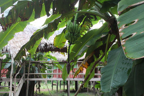 Und dann ist es Zeit für den Besuch bei Manuel. Seit ich hierher komme, besuche ich ihn in seinem grossen Haus. Sehen kann er wegen dem grauen Star fast nichts mehr, aber er zeigt und, dass er mit seinen 86 Jahren noch gut auf den Beinen ist und stampft dabei heftig auf den Boden. Ich frage ihn, ob er Kokosnüsse habe und schon bald erfrischen wir uns alle an einer frischen Coco, die einer seiner Söhne mit der Machete zurechthaut. Wovor er denn lebe, wollen wir wissen. Er hat ein grosses Yuccafeld, viele Kokosnüsse, Mais und auf den Sandbänken Reisfelder. Ausserdem gibt es hinter dem Haus ein paar Hühner und Enten. Was nicht selber verbraucht wird, wird auf dem Markt in Nauta verkauft.