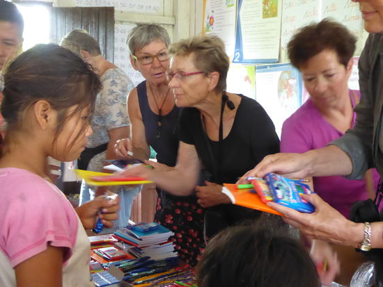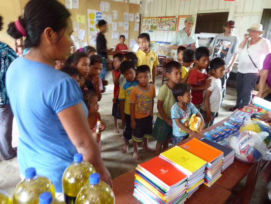 Eigentlich war vorgesehen, dass wir die Schule während der Schulzeit besuchen, doch Jesus, der Tenete erklärt, dass im Moment schulfrei sei. Die Kinder kommen nach und nach aus den Häusern hergelaufen um zu sehen, was es heute gibt. Auch die Frauen zeigen sich und am Schluss sind wir alle zusammen im Schulzimmer. Hier hat Keyla unsere Geschenke aufgebaut: Farbstifte, Bleistifte, Schulhefte, Radiergummis und andere Dinge für die Schule. Nach ein paar Reden, denn es ist ein offizieller Anlass, verteilen wir die Sachen an alle Kinder.