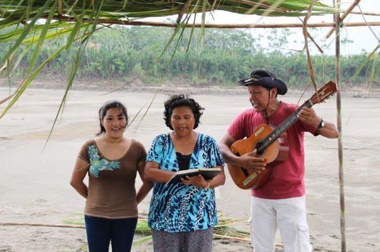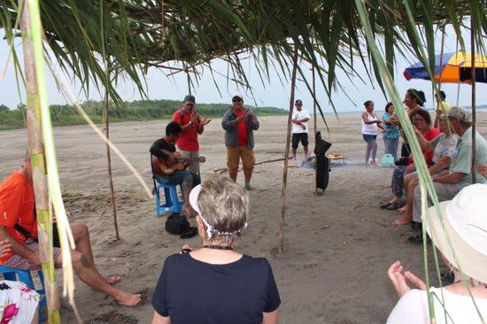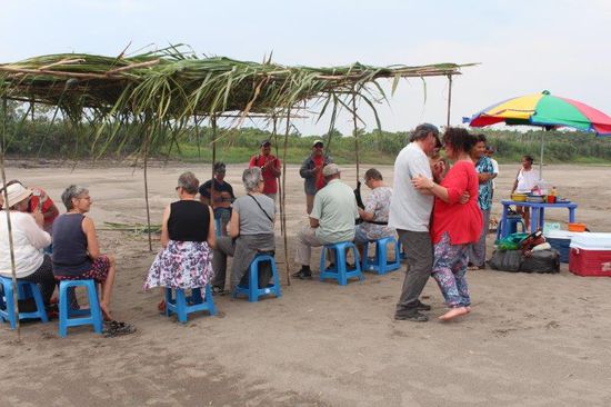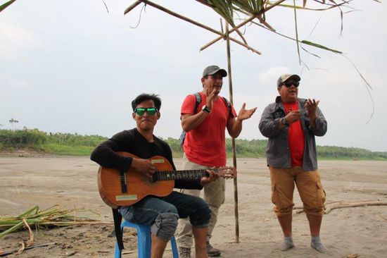 Und dann holt Pablo seine Gitarre und singt zusammen mit Teresa und Keyla ein Lied für uns. Natürlich will auch Freddy nicht hintenanstehen. Er übernimmt die Gitarre, Leo schlägt mit zwei Löffeln den Rhythmus und Alex hilft beim Singen. Guantanamera, Bambolera und andere Melodien erklingen schon bald über den Sand und alle singen und klatschen mit. Als Susanne und Victor anfangen zu tanzen, ist die Amazonas-Strandparty in vollem Gang.