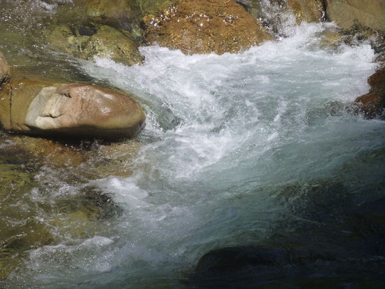 Auf halbem Wege liegt ein Restaurant, wo man sich von einem Gondoliere ein Stück weit über den Fluss schippern lassen kann. Hier gibt es gar seltsame Flussbewohner, die aussehen wie Riesen-Kaulquappen. Wir konnten leider nicht herausfinden, um welche Spezies es sich hierbei handelte.