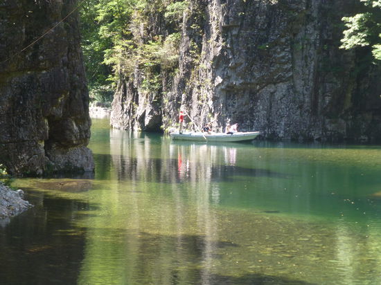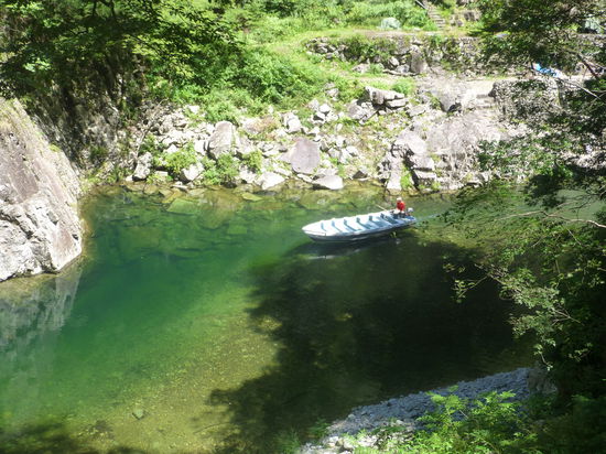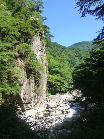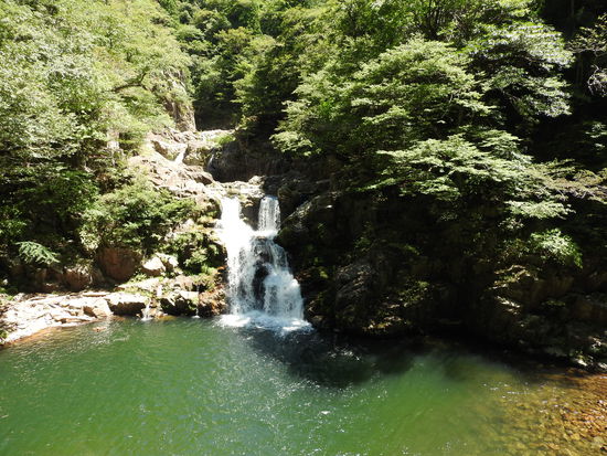 Zu Beginn des Weges treffen wir eine Gruppe mit jungen Kajak-Fahrern, dann wird es zunehmend einsam. Ein bisschen ist es hier wie in den Pyrenäen. Ein wilder Flusslauf, tiefblaue Wasserbecken und kleine Wasserfälle. Alles überragt von imposanten Felsformationen. Unser Wanderweg schlängelt sich entlang des Flusses. Allerdings ist er nur in eine Richtung zu gehen. Wir müssen uns also irgendwann zu einer Umkehr entscheiden und die gleiche Strecke wieder zurück wandern. Nach etwa 2 Stunden und zwei Drittel des Weges kehren Lea und ich um. Wir möchten den Express-Bus um 15.00 Uhr erreichen und wandern gemütlich zurück. Annika und Katrin wollen noch bis zu den viel gepriesenen Wasserfällen weiter wandern und evt. einen späteren Bus nehmen. Der benötigt jedoch 3-4 Stunden für die Fahrt nach Hiroshima.