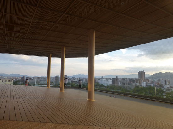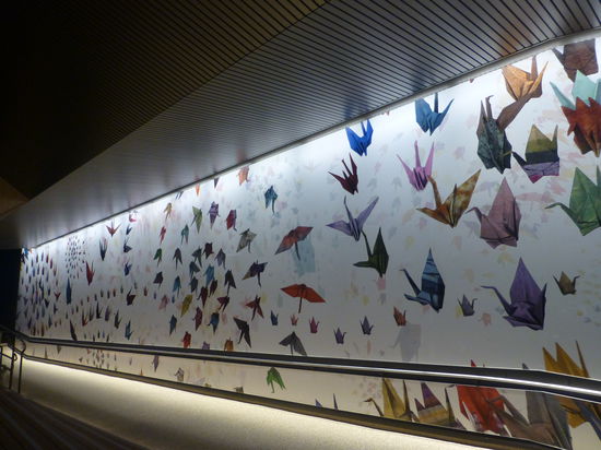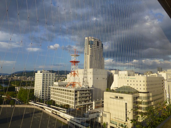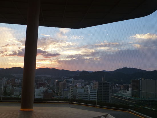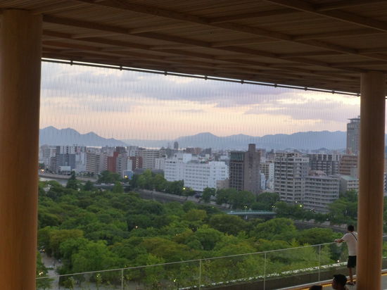 Alle zusammen fahren wir also zurück, shoppen noch ein paar Souvenirs (insbesondere Grüntee und Matcha) und berappen den Eintritt von 1.700 Yen für den Orizuru-Tower. Die Plattform auf dem Hochhaus unmittelbar beim Atombomben-Dom scheint ziemlich neu zu sein. Die Aussicht von oben ist grandios. Zudem sind wir fast alleine. Wir genießen einen tollen Sonnenuntergang bei einem Feierabend-Bier. Das Stockwerk unter der Aussichtsplattform ist multimedial aufbereitet und lässt uns nochmals in die Geschichte der Stadt eintauchen. Anschließend gehen, bzw. rutschen wir über einen Wandelgang vom 12. Stock hinunter ins Erdgeschoss. Der Abstecher hierher hat sich wirklich gelohnt.