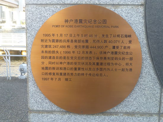 Hinter dem Meeresmuseum etwas versteckt liegt der Kobe Earthquake Memorial Park. Er erinnert an das verheerende Erdbeben 1995 als große Teile Kobes und insbesondere des Hafens zerstört wurden. Einige Bereiche sind in diesem Zustand belassen worden und vermitteln einen Eindruck von den Ausmaßen der Zerstörung.