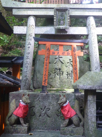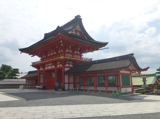 Nach unserem Besuch in Arashiyama fahren wir mit dem Zug ans andere Ende der Stadt zum Torii-Schrein Fushimi Inari Taisha. Eine der bekanntesten Sehenswürdigkeiten Kyotos. Hier ziehen sich die roten Toriis dicht an dicht über mehrere Kilometer den Berg hinauf zum Gipfel des Inari-yama. Wen wundert's, dass auch hierher die Menschenmassen pilgern. Doch der Anblick der vielen roten Toriis ist schon sehr beeindruckend. Uns rinnt der Schweiß zwar in Strömen, aber wir gehen ein gutes Stück durch die endlos scheinenden Arkadenreihen bergauf. Allerdings verzichten wir auf die kompletten 4 Kilometer bis zum Gipfel. Das ist uns heute doch zu anstrengend. Überall finden sich auf dem Gelände Steinfüchse. Sie gelten als Boten von Inari, dem Gott der Reisernte. Manche der Figuren haben aus diesem Grund Reis-Ähren umgebunden. Der Schlüssel, den sie im Maul haben, soll die Tür zur Reiskammer öffnen.