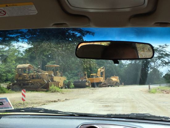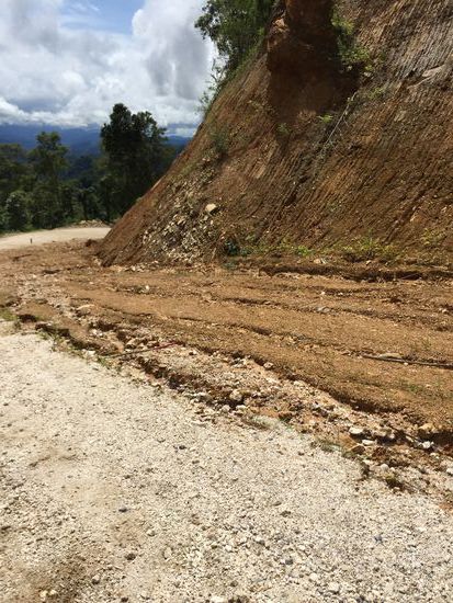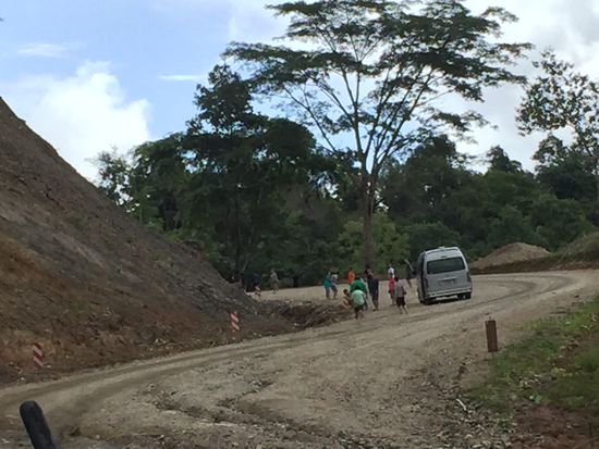 Der Fluss Yuam ist über Nacht ziemlich angestiegen und fliesst trübe, mit Holzstücken durchsetzt an unserem schönen Gästehaus vorbei. Die Wolken hangen tief, als wir frühstücken. Doch als wir losfahren, heben sie sich langsam, und die Sonne blinzelt ab und zu mal dazwischen. Die Strecke südwärts Richtung Mae Sot führt uns wieder durch dichten, grünen Wald, ein paar Dörfer mit Bergstammbewohnern und hier und da Reis- und Maisfelder. Nach einer Stunde wird die Strasse sehr rau, und wir kommen nicht mehr so schnell vorwärts. Doch es kommt noch rauer... Auf etwa fünf Kilometern ist die Strasse, die sich durch die steinigen, rotbraunen Hügel frisst, gar nicht mehr geteert. Rinnen und Buckel durchziehen den steilen Fahrweg - einmal mehr sind wir sehr dankbar um unser hochgesetztes, starkes Auto. Mit einem normalen PW wäre dieser Abschnitt nicht fahrbar gewesen. Wir begegnen zwei Minibussen, deren Fahrgäste den Berg hochgehen mussten. Baumaschinen stehen bereit, die Strasse ist im Bau. Aber es scheint, als würde abgewartet, bis die Regenzeit vorbei ist, bis weitergearbeitet wird.