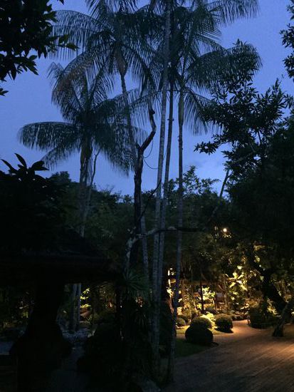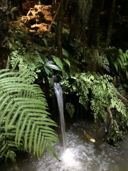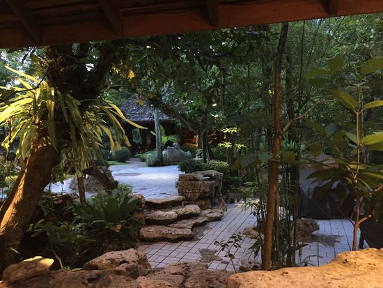 Das Nachtessen nahmen wir im schönsten Restaurant ein, das wir je besucht hatten. Da hat sich ein (Garten-)Architekt seinen Traum erfüllt: Genial angelegt liegen massive Holztische zwischen Bächen, kleinen Wasserfällen, hellen Steinen, Bäumen und Pflanzen aller Art. Alles ist ultrasauber. Auch die Abschlüsse, die Kanten sind hier wirklich schön gemacht, nicht wie so oft nachlässig und ungenau. Ein herrlicher Ort!