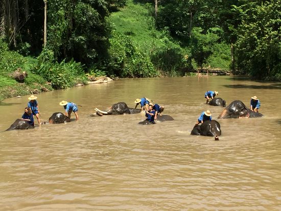 Das Zusehen beim Elefantenbaden ist echt spassig. Die Tiere mögen das Wasser sehr, tauchen unter, spritzen umher.