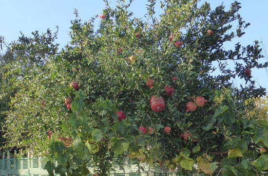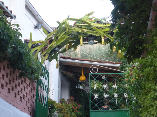 Kaum sind wir aus dem Haus, werden wir zum Kaffee eingeladen. Meine Frau Ulrike ist mal wieder zu schüchtern, was sonst gar nicht ihre Art ist. Bougainvillas, riesige Granatäpfel, aber auch verbrannte/ vertrocknete Feigen und blühende Tabakpflanzen begleiten den Rundgang.