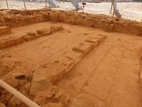 im Boden eines jeden Raumes sind Rinnen und ein eingelassenes Gefäß (vorne) zum Auffangen von verschüttetem Öl, Wein oder Honig