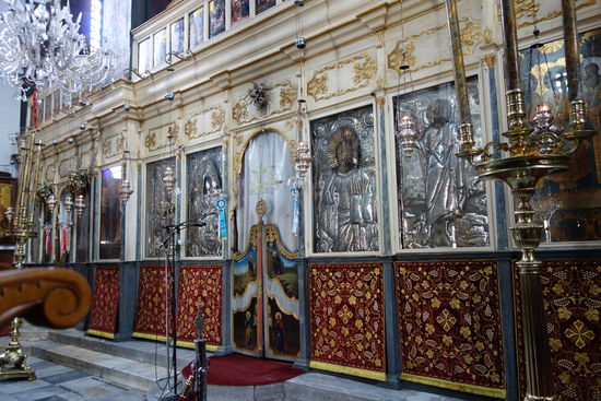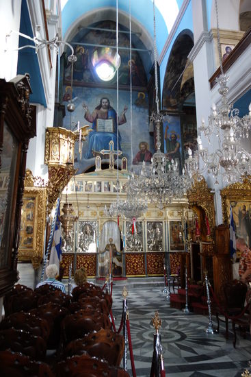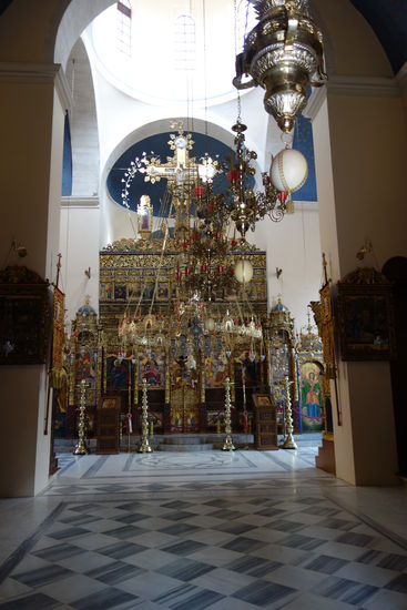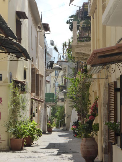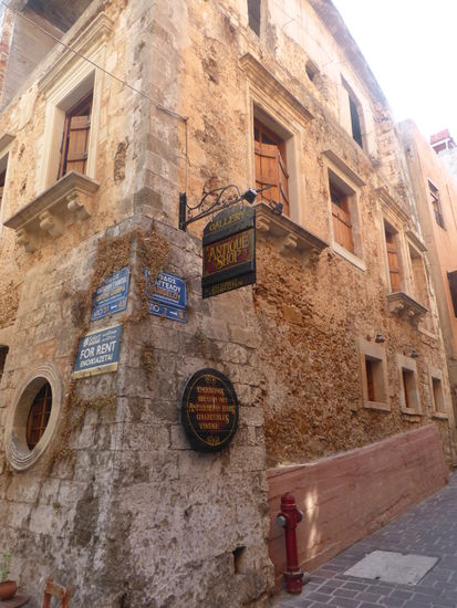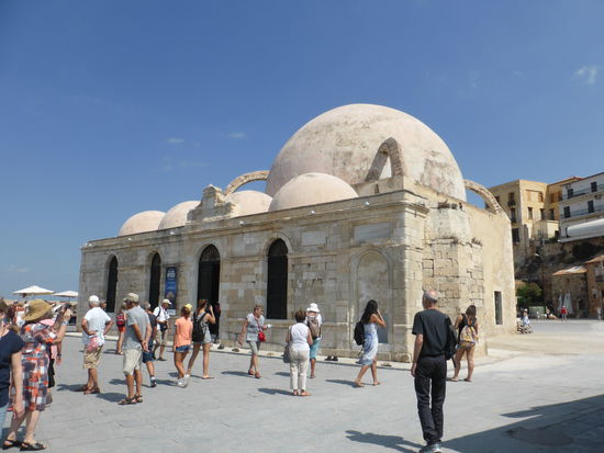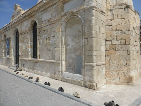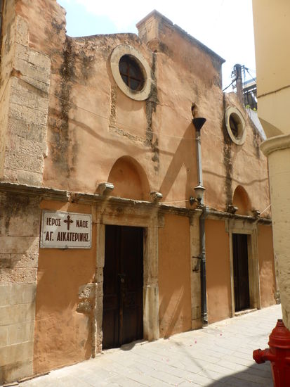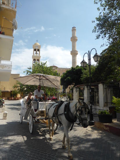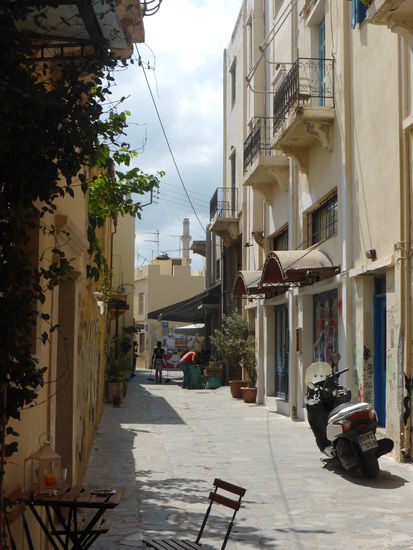 Kaum drehen wir von der Hafenmole in die Stadt ab, sind wir fast allein und schlendern durch enge Gassen. Ab und zu kann man ein Minarett sehen. An einem kleinen Platz steht dann die Agios Nikolaos - die einzige Kirche Kretas, die sowohl einen Kirchturm als auch ein Minarett besitzt. Natürlich ist auch sie wieder verschlossen.