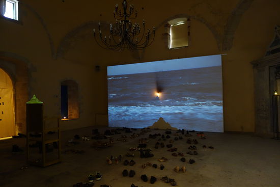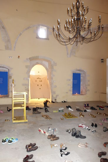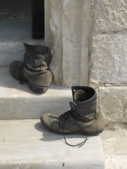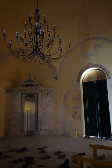 Nach halber Umrundung des Hafens sehen wir vor der kleinen Hasan-Pascha- Moschee eine ganze Reihe Schuhe stehen. Da sind vergammelte, dreckige bei und wir wundern uns schon und wollen unsere bereitwillig ausziehen, also wir erfahren dass dies zu einer Kunstinstallation gehört, die im Inneren fortgesetzt wird . '700 Namen für Gott' Trotzdem wollen wir den Innenraum sehen, löhnen einen Euro und schauen uns nebenbei auch die Installation an.