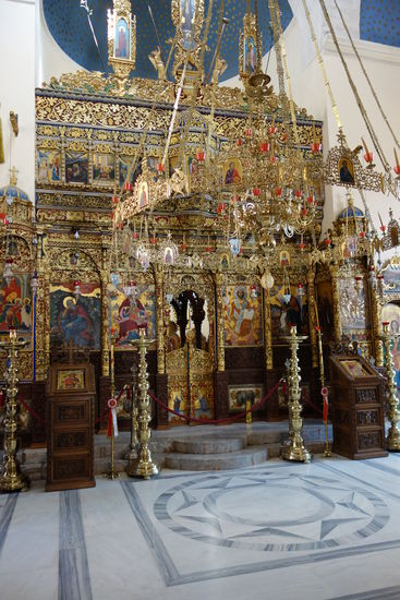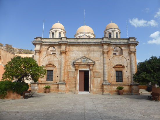 Bevor wir die Rückfahrt antreten fahren wir noch zum griechisch-orthodoxen Kloster Agía Triada, dessen beeindruckendes Ensemble in der Nähe des Airport auf der Halbinsel Akrotiri liegt. DIe Zufahrt ist durch eine lange Baumallee mit weiß getünchten Stämmen und sieht schon phänomenal aus.