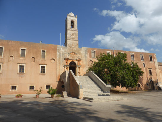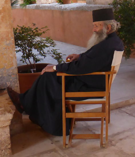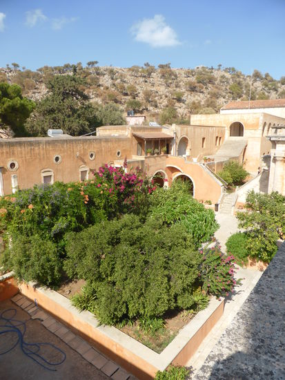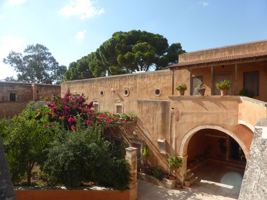 Wie bei vielen Klöstern werden von Mönchen Produkte hergestellt und auch verkauft. Im diesem Kloster gibt es einen Weinkeller, in dem aber auch Öle, Säfte, Liköre und andere kretische Pridukte verkauft werden. Meine Frau Ulrike wird nach ausführlichen Proben von Ölen und Essigen mit einem besonderen Traubensirup (Balsam) für Salate fündig.