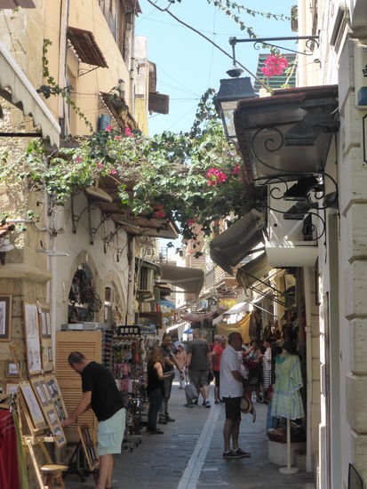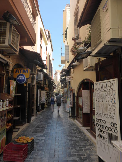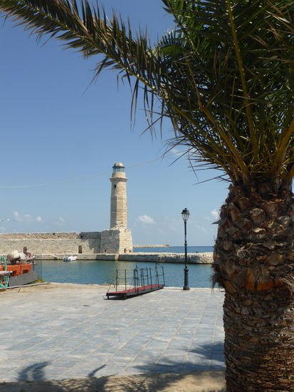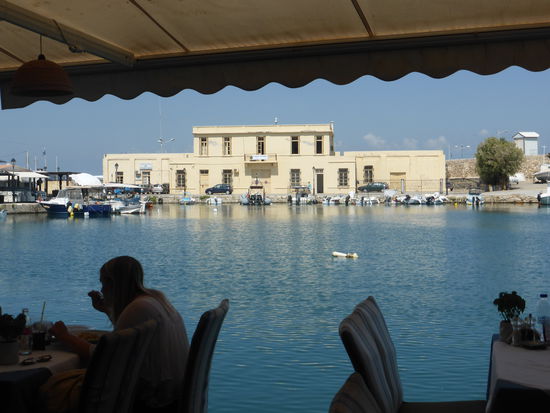 Der venezianische Hafen ist kleiner als der von Chania, aber ebenso so schön. Aber leider ist auch hier der Durchgang durch die am Kai sich aneinanderreihenden Lokale immer enger geworden, so dass die Animateure die Touristen besser 'angeln' können. DIe Fischauslagen locken zwar, aber bei über 30 Grad ist uns einfach nicht zum Lunchen.