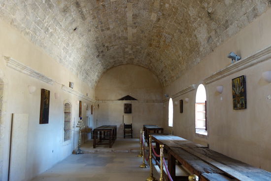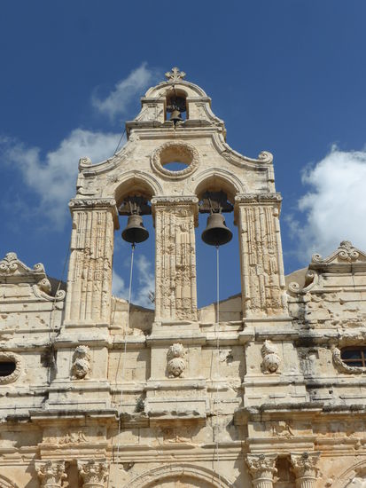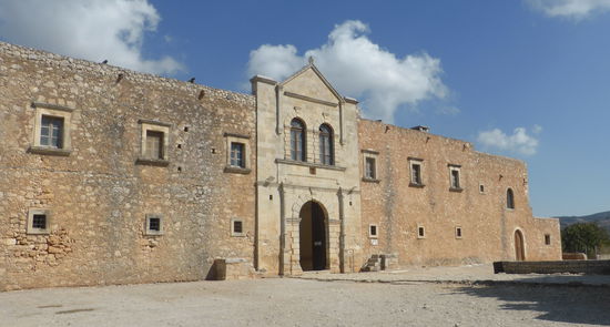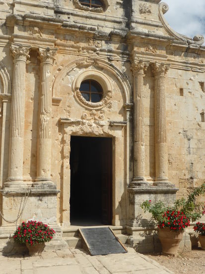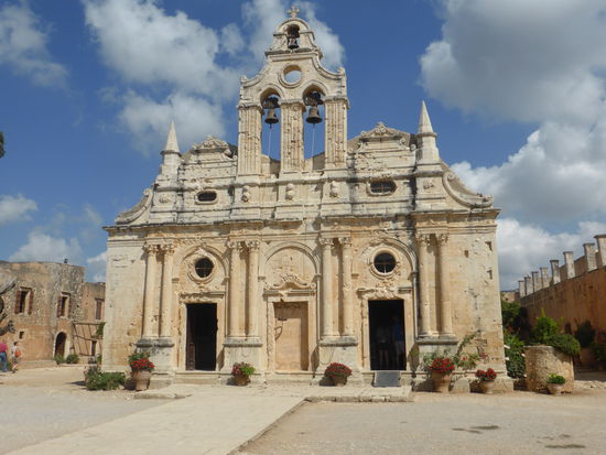 Meine Frau Ulrike ist schon fast der Meinung, dass es Zeit für die Rückkehr wird. Aber wir beschließen doch den Rückweg durch die Berge und nicht über die Schnellstraße. Denn dann können wir auch das Nationaldenkmal Kretas, das Kloster Arkadi besuchen. Endlich finden wir auch die grandiose Bergwelt, da sich der Weg entlang einer Schlucht auf 500 m Höhe entlangschlängelt. Nationaldenkmal deshalb, weil sich dort 1866 325 bewaffnete Freiheitskämpfer den Türken entgegengestellt haben. In der Anlage, die nicht so gepflegt und sauber restauriert erscheint wie das gestern besuchte Kloster, gibt es einiges anzuschauen.