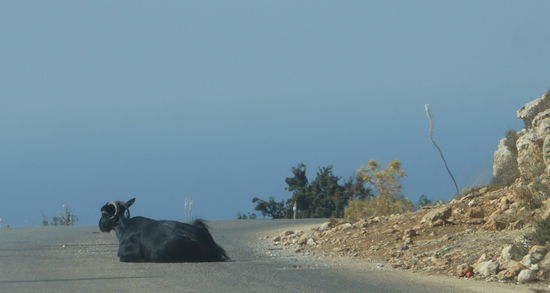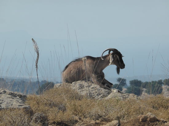 Auf der Weiterfahrt über schmale Bergsträßchen begenet uns niemand, so kann auch der Ziegenbock beruhigt auf der Straße ein Mittagsschläfchen halten.