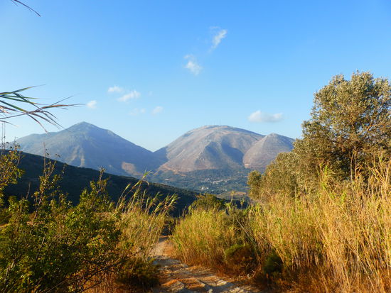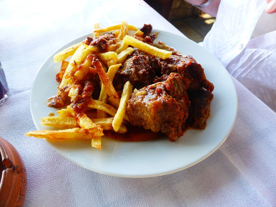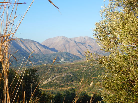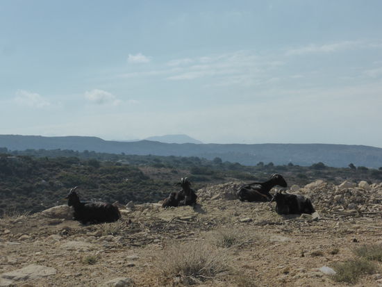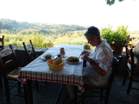 Danach wollen wir den Rückweg antreten, aber da wir von unserer 'einsamen' Hütte keine Gelüste verspüren, abends das Haus zum Essen zu verlassen, beschließen wir ein Lokal mit wundervoller Aussicht über die Berglandschaft besuchen, um wenigstens einmal kretisch im Restaurant zu essen. Gegen 17.00 Uhr kann man hier Essen bestellen und das Gericht 'Ziege in Tomatensauce' ist wie schon oft gehabt ausgezeichnet, da es bis zur Unendlichkeit gargekocht wurde. Wie sehr häufig sind auch hier noch die Knochen am Fleisch, da die Ziege 'zerhackt' wurde. Man muß also auf kleine Knochen aufpassen.