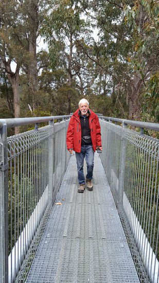Nun waren wir erst recht gespannt auf den Air Walk. Der Weg führte ca. 24 Km auf einer kurvenreichen Strasse ins Tal hinein. Zu hinterst angelangt, lösten wir bei der Tourist Information die Eintrittskarten und suchten den Aufgang zum Air Walk. Das ist ein stabiles Metallgerüst mit einem 600m langen Gitter-Steg ca. 50m über dem Boden. Man ist den Baumwipfeln teilweise sehr nahe, andererseits überragen zahlreiche Bäume den Steg um beinahe das Doppelte. Nach dem Steg sind wir einem Waldweg gefolgt, der sich durch den Wald schlängelte und uns zu den Hängebrücken führen sollte. Da ich als Pilz- und Botanik-Interessierte immer auf den Boden schaute, konnte mir natürlich nichts Derartiges entgehen. Plötzlich entdeckte ich einen Pilz auf einem Baumstumpf, den ich mir ganz genau ansah. Dass es ein Röhrling war, freute mich ganz besonders. Genauer bestimmen konnte ich ihn aber nicht. Auch bei den Pflanzen gab es Interessantes zu beobachten, auch sie waren nicht zu bestimmen. Es gab nur sehr wenige Arten, die mit unseren vergleichbar waren. Endlich hatten wir die Hängebrücke erreicht. Auch diese war sehr stabil gebaut, aber schaukeln konnten wir trotzdem. Bäri und ich bewegten uns im selben Rhythmus, sodass sie sich hin- und her bewegte. Ich bin mir nicht sicher, ob die Personen vor uns, sich geängstigt hatten. Sie zeigten es jedenfalls nicht und lernten uns noch einige australische Ausdrücke.