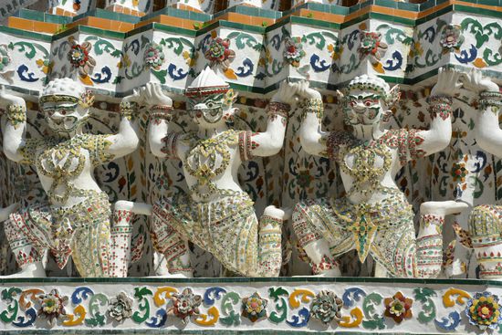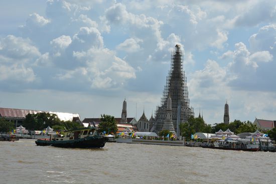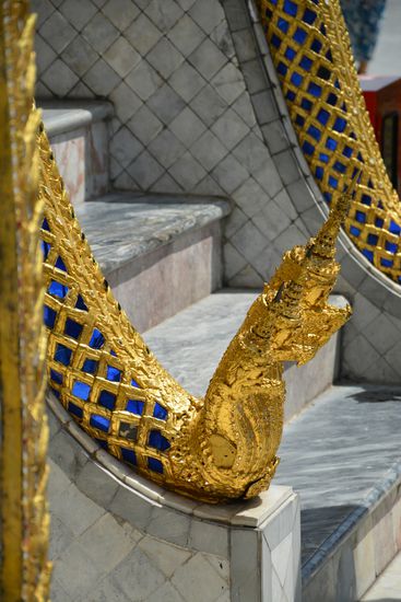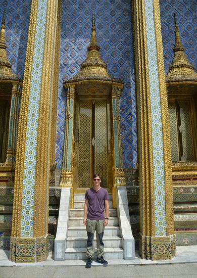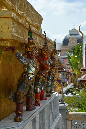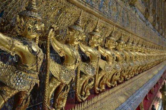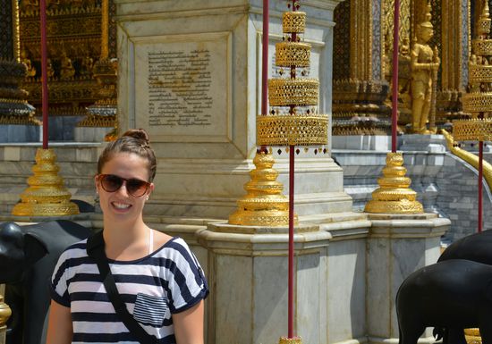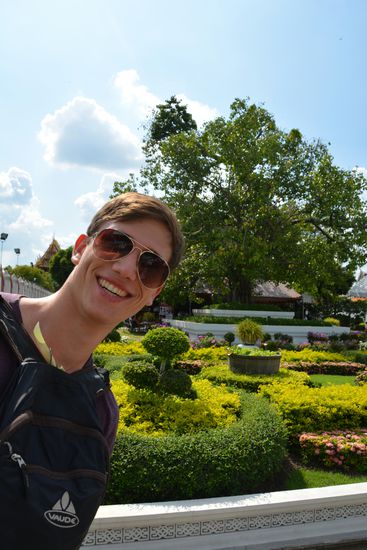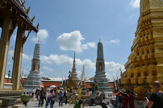 Der heutige Tag war ganz dem Kulturellen gewidmet. Mo und ich besichtigten zuerst den Grand Palace. Dieser war früher die Residenz des Königs und ist heute gegen Eintrittsgebühr teilweise öffentlich zugänglich. Sehenswert ist alles, aber vor allem die Tempelanlage rund um den Wat Phra Kaeo, den Tempel des Smaragd Buddhas. Zusammen mit hunderten anderer Touristen und bei 37 Grad und Sonne, erkundeten wir also diese Tempelanlage. Alles ist riesig groß und die Gebäude glitzern um die Wette. Immer wenn man denkt, man hätte alles an einer Fassade gesehen, entdeckt man noch ein neues Detail, so genau und kleinteilig sind die Gebäude verziert.