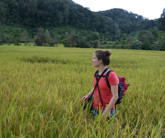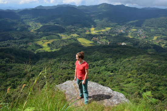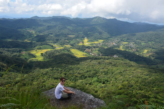 Das Frühstück war sehr üppig mit Rührei, Toast, Wassermelone, Marmelade und Reis und gegen 10:00 Uhr gingen wir, über einen anderen Weg als am Vortag, durch Reisfelder zurück in das Dorf und von da aus nocheinmal hoch auf einen Berg. Bis wir allerdings den Berg erreichten, mussten wir über einen Pfad, oder vielmehr neben einem Pfad, gehen der nach der regnerischen Nacht eher einem Matsch-Fluss glich. Mit viel Geschlidder und sehr dreckigen Schuhen erreichten wir nach gut einer Stunde wieder einen Weg auf dem man normal laufen konnte, was vor allem Claras laune wieder besserte . Zum Mittagessen legten wir Bananenblätter auf den Weg und setzten uns darauf und wickelten dann unsere Essenspäckchen aus, die wir von der Lodge mitgenommen hatten. Nach dem Essen gingen wir noch ein kleines Stück im Wald und dann erreichten wir freies Feld und die Aussicht von dort entschädigte uns für den mühsamen Aufstieg.