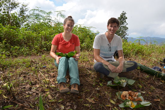 Gegen 12:00 Uhr machten wir auf einer Bergkuppe Mittagspause, wo wir unsere Essensbündel mit Reis, Gemüse und Ei bekamen. Dazu gab es noch frittierten "Baby-Gibbon", welcher erstaunlich nach Hühnchen geschmeckt hat , zwei verschiedene Arten Currypaste und Gemüse. Nach dem schweißtreibenden Aufstieg, war das Essen eine schöne Belohnung und auch die Aussicht auf die umliegenden Berge und Dörfer war wunderschön.
