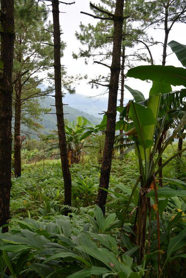 Die erste Pause machten wir in einem Bananenwald, wo unsere beiden Guides Bananenblätter abschnitten, die wir am Abend als Unterlagen benutzten und in die unser Mittagessen für den nächsten Tag eingepackt wurde .