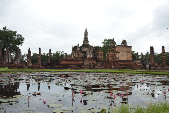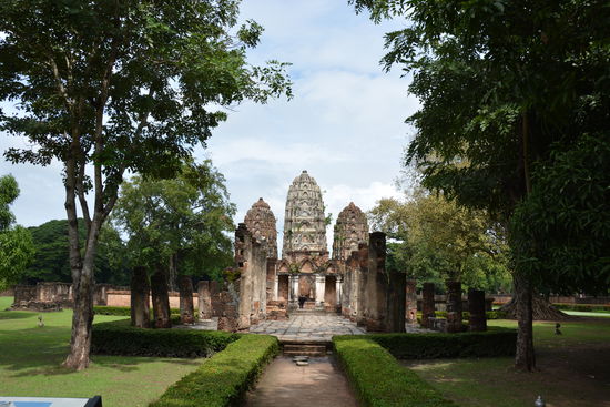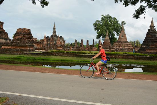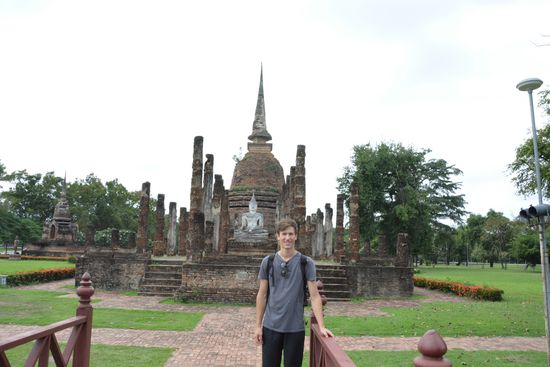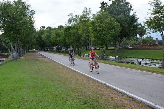 Der Bus ließ uns direkt vor dem Haupteingang des Historical Parks raus, wo wir uns 2 Fahrräder liehen, mit denen wir den Tag über den Park und die Gegend erkundeten. Der Eintritt in den Park war wegen des Todes des Königs kostenlos, allerdings mussten wir jeder 10 Baht Gebühr für unsere Fahrräder bezahlen. Der Historical Park an sich besteht aus vielen, unterschiedlich gut erhaltenen, Tempelruinen, die in einem sehr gepflegten Park liegen und durch die man sehr gut mit dem Fahrrad fahren kann.