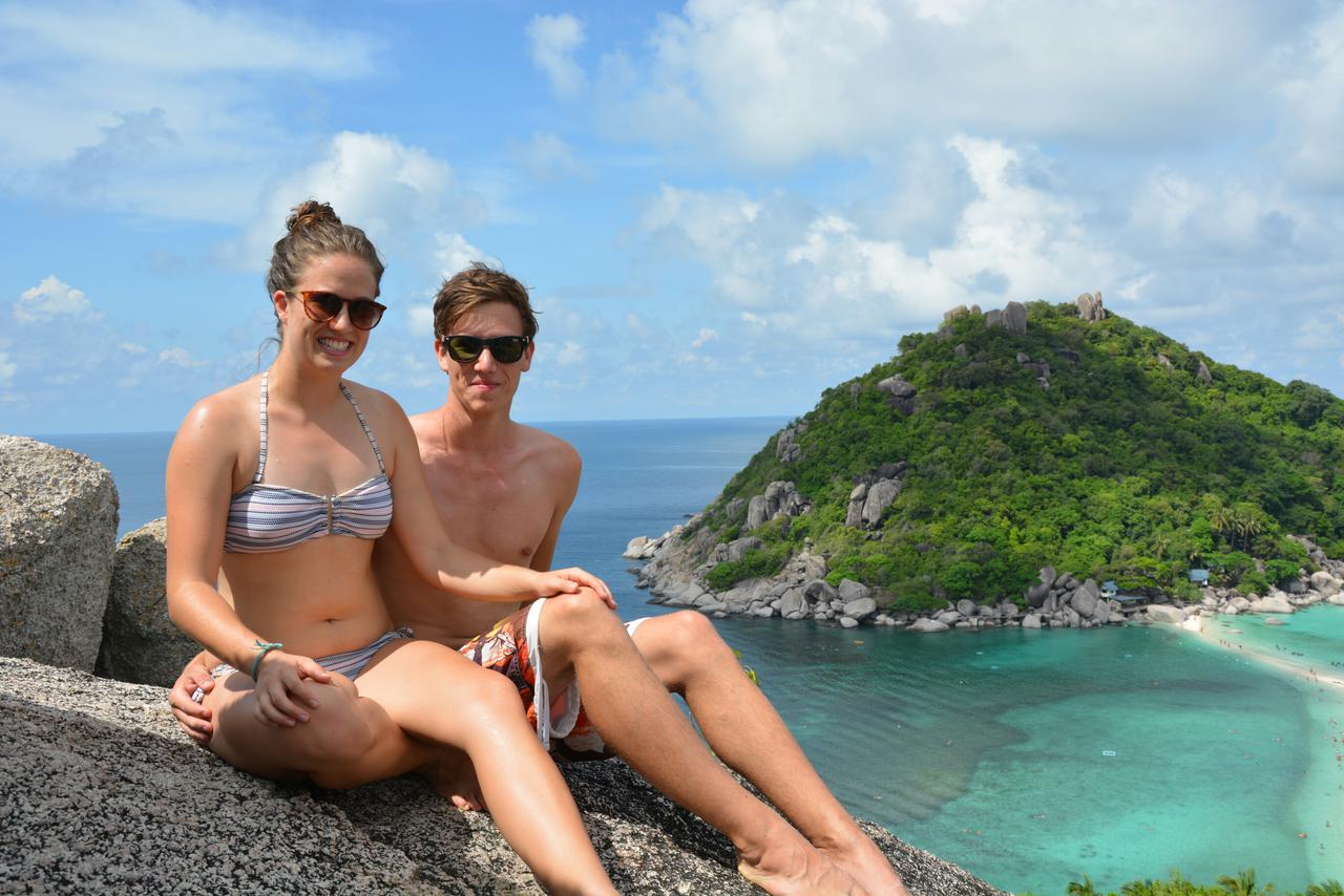 An unserem letzten Tag auf Koh Tao waren wir auf Koh Nangyuan, einer kleinen Insel vor Koh Tao. Wir fuhren mit dem Taxiboot hin, welches uns auch um 15 Uhr wieder abholte. Die Insel gilt als eine der Schönsten weltweit und ist dementsprechend besucht. Man muss 100 Baht Eintritt zahlen und darf keine Plastikflaschen oder Dosen mitbringen. (Wir hatten natürlich trotzdem unser Wasser dabei, wir sind ja nicht so blöd und schmeißen die Flasche irgendwo hin...) Wir waren schon begeistert von dem Flaschenverbot bis uns klar wurde dass alles nur Heuchelei war...Natürlich lag am Strand leider trotzdem Müll rum und das Flaschenverbot ist wahrscheinlich nur dazu gut, dass die ihr eigenes Wasser verkaufen. Auch darf man sich nicht mit Handtuch auf den Sand legen, angeblich damit man nicht ausversehen Sand mitnimmt. Dafür soll man dann für 150 Baht eine Liege mieten. Haben wir natürlich nicht gemacht, sondern uns einen Stein zum drauf Liegen gesucht! Abgesehen davon ist die Insel wirklich traumhaftm. Das Wasser ist türkis und man kann wunderbar schnorcheln in "Japanese Garden", wo es Korallen und viele Fische gibt. Als wir ins Wasser gingen war die Insel noch recht leer, als wir wieder rauskamen leider recht voll... Vor allem Chinesen waren gekommen. Diese wollten auch alle schnorcheln, taten dies aber nur im flachen Wasser über Sand und mit Schwimmwesten, weil sie alle nicht schwimmen können. Das ganze war zwar sehr lustig mit anzusehen, aber ich frage mich warum man schnorcheln geht wenn man nicht schwimmen kann und sich deshalb nur dort bewegt wo es flach ist und man eh nix sieht. Da es jetzt recht voll war und außerdem die Flut langsam den Strand unter Wasser setzte, beschlossen wir zum Viewpoint zu laufen. Von dort aus hatte man einen tollen Blick auf die Insel, aber leider war es auch hier recht voll. Danach suchten wir uns einen anderen Stein, der etwas abseits lag, gingen nochmal woanders schnorcheln und lasen bis uns unser Taxiboot wieder abholte. Insgesamt hat sich der Besuch der Insel wirklich gelohnt, aber in der Hauptsaison empfehlen wir niemanden hierher zu kommen! Man muss die Menschen einfach ausblenden und das türkisblaue Wasser genießen, denn im Wasser sind immer am wenigsten Leute Was wir etwas schade fanden war, dass man das Eintrittsgeld anscheinend nicht dazu nutzt, den Strand sauber zu halten...Den Ruf der Trauminsel hat die Insel schon zu Recht, allerdings wäre sie ohne die vielen Sonnenliegen und Menschen viel schöner