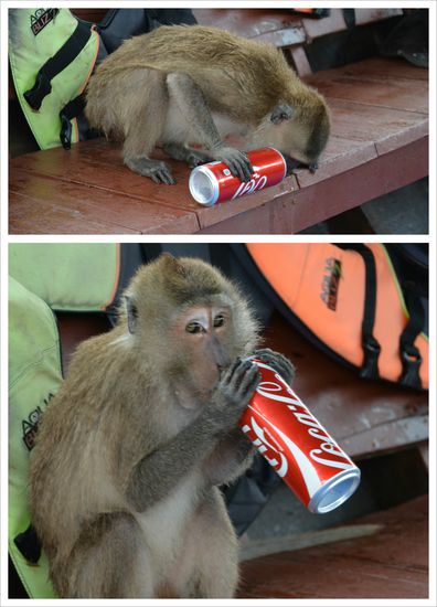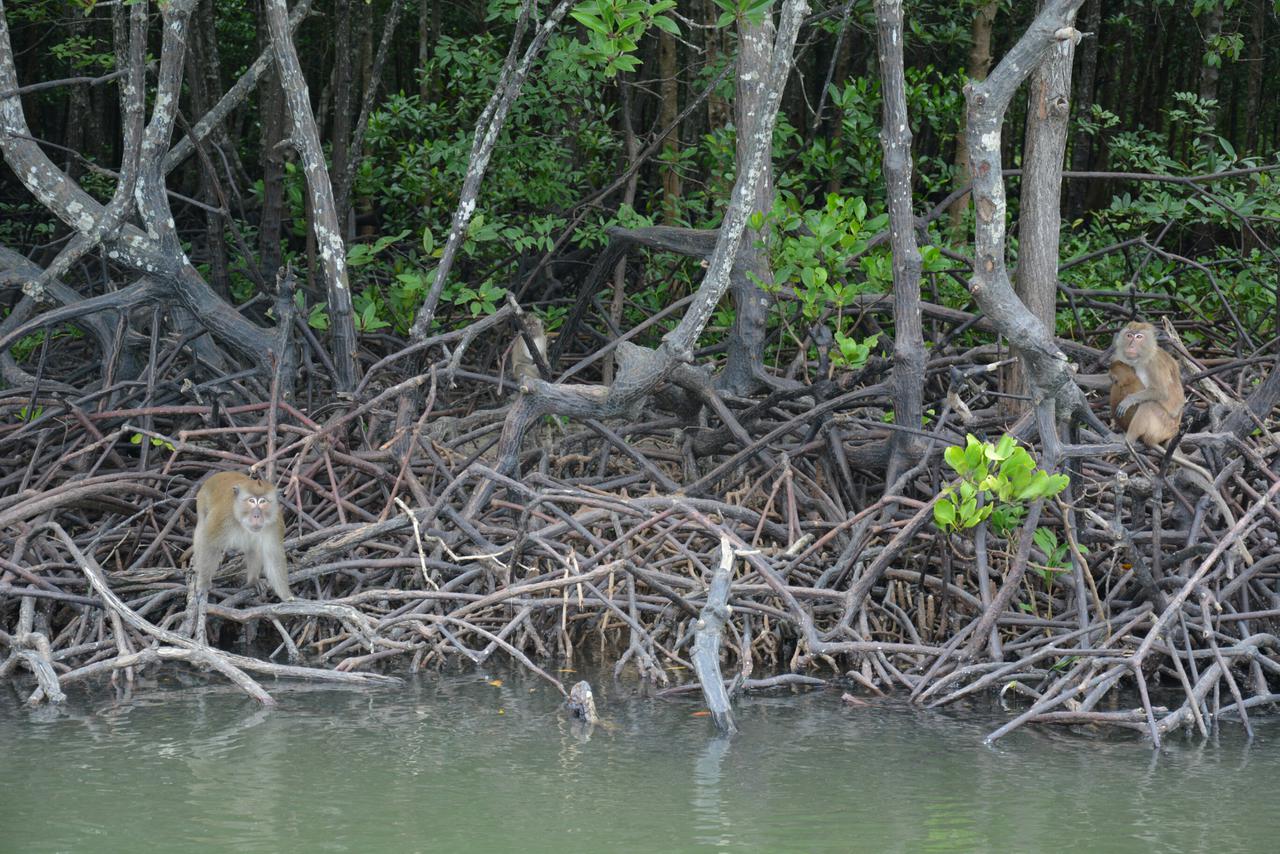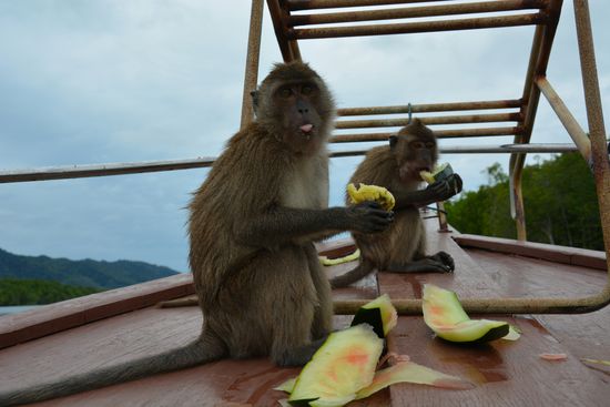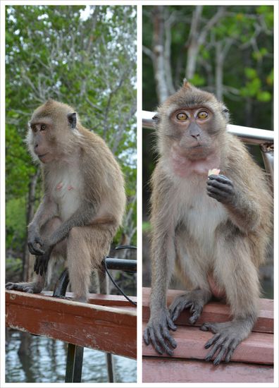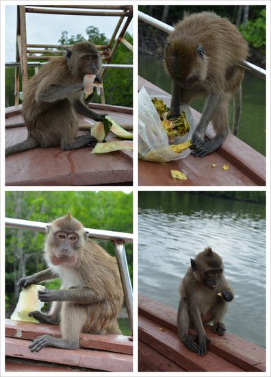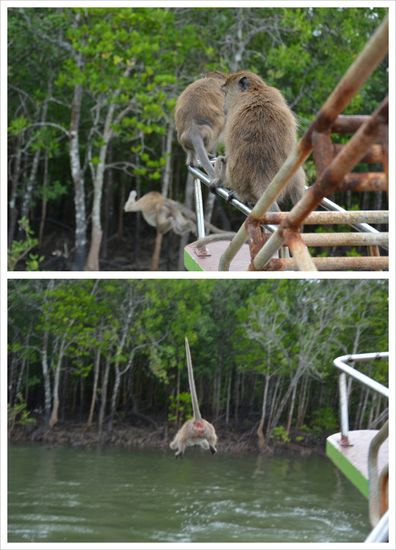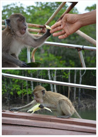 Wir hielten in einem Seitenarm der Mangroven und unser Guide fütterte die Affen mit den Resten der Ananas an, sodass sie bis auf unser Boot kamen. Nachdem die Affen das Meiste aufgegessen hatten, wurde der Motor des Longtails gestartet und die Affen sprangen sofort in den Fluss und schwammen zurück zum Ufer .