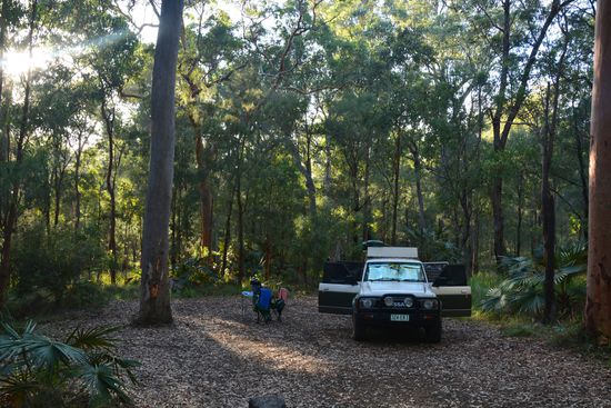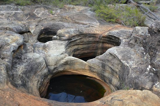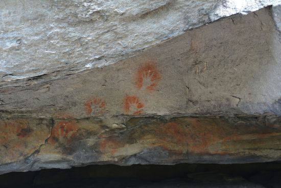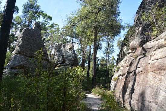 Nach einer erneut sehr angenehm kühlen Nacht, standen wir am nächsten morgen schon um 6.30 auf. Nach dem Frühstück gingen wir los zum Goon Goon Dina, einem 2,5km langen Rundweg. Es hingen viele Spinnennetze quer über dem Weg, sodass Mo schließlich mit hocherhobenem Stock vorausging, um die Netze kaputt zu machen . Auf dem Weg sind kleine Infotafeln über die Aboriginies, die in dem Gebirgszug gewohnt haben und über die weißen Siedler, die dort später Rinder gehalten und Holz gefällt haben aufgestellt. Das Highlight waren alte Felsmalereien, die von den Aboriginies stammen. Sie zeigen Hände. Auf dem Weg kamen wir durch einen Bach, der allerdings fast trocken war. Die Eukalyptusbäume im NP hatten ganz rote und nicht wie sonst weiße Stämme und wir fragten uns, ob die Farbe wohl vom roten Boden oder dem Eisen darin kommt.