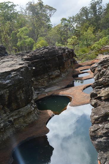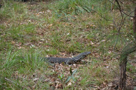 Zurück am Camp starteten wir den zweiten Weg, den zum Mook Mook Lookout. Auf dem Weg dorthin kamen wir durch ein fast trockenes Flussbett aus Felsen und Sandstein. Der Sandstein war ganz ausgehöhlt, sodass sich viele kleine Badelöcher bildeten. Da der Himmel sich zuzog, beeilten wir uns etwas, da der Rückweg auf der Schotterpiste bei Regen wahrscheinlich eher unangenehm geworden wäre. Wir gelangten trockenen Fußes zum Aussichtspunkt, von dem aus man einen schönen Blick auf die bewaldeten Berge und eine Steilklippe hatte. Auf dem Rückweg sahen wir einen ca 1m langen Leguan . Wir waren insgesamt ca. 6km gelaufen. Nun packten wir unsere Sachen zusammen und machten uns um 10.30 Uhr auf den Rückweg zum Dingo Roadhouse, wo eine Dusche auf uns wartete . Der Nationalpark hat uns sehr gut gefallen, vor allem wegen der Aussicht, den tollen Sandsteinformationen und der Felsmalerei. Es war sehr angenehm mal wieder eine Dusche zu haben, auch wenn ich (Clara) meine mit einem großen knallgrünen Frosch teilen musste...