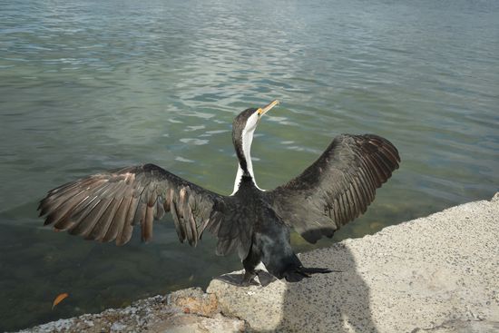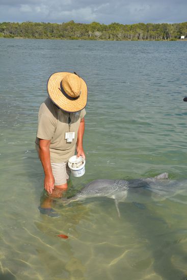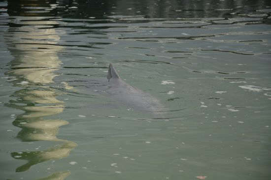 Morgens um 7 Uhr gingen wir zum Barnacles Dolphin Center, um Delfine zu sehen. Die Delfine kommen dort jeden morgen hin und werden dort gefüttert. Es sind wilde Delfine und als wir da waren, war auch nur eins von den vier Tieren, die normalerweise kommen, da. Die Delfine sind Australian Humphback Dolphins, die nur im flachen (bis 20m tiefen) Küstengebiet und in Flussmündungen leben. Fütterung ist erst um 8 Uhr und bis dahin durften wir im kniehohen Wasser stehen und den Delfin beobachten. Er kam sehr nah an die beiden Freiwilligen Helfer heran, war also an Menschen gewöhnt. Bis kurz vor der Fütterung waren sehr wenige Leute da, am Ende waren es ca 25 Leute.