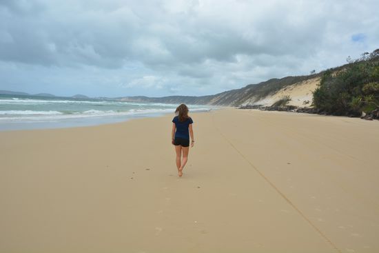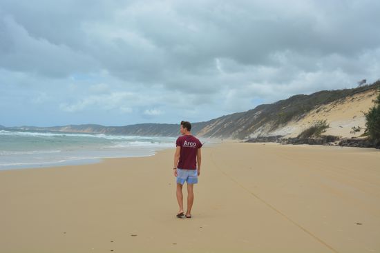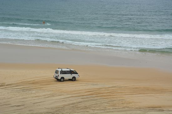Gegen 10 Uhr verließen wir Tin Can Bay und fuhren die kurzen 34km nach Rainbow Beach. Dort machten wir als erstes einen Strandspaziergang um die farbigen Sandklippen zu sehen, die dem Ort ihren Namen gaben. Der Strand ist ewig lang und die Brandung war hier nach dem Ende des Great Barrier Reef auch ganz ordentlich. Als erstes fiel uns auf, dass Autos am Strand entlang fuhren. Da wir uns einen Besuch der vorgelagerten Insel Fraser aus Kostengründen sparen wollten, beschlossen wir, stattdessen hier mal am Strand entlang zu fahren . Genau für solche Abenteuer hatten wir uns ja schließlich für den 4WD und gegen den Platz in einem Van entschieden. Der Sand am Strand hat übrigens tatsächlich viele verschiedene Brauntöne und die Klippen sehen wirklich toll aus.